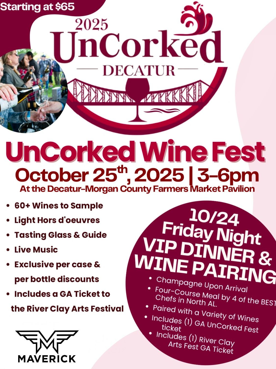 Savor the flavors of fall at Uncorked in downtown Decatur, AL is a celebration of wine, art, and community. Enjoy curated tastings, seasonal bites, and entry to the River Clay Arts Festival. With live music by local singer-songwriter Gray Cauthen, it’s the perfect afternoon to sip, sample, and savor the season.